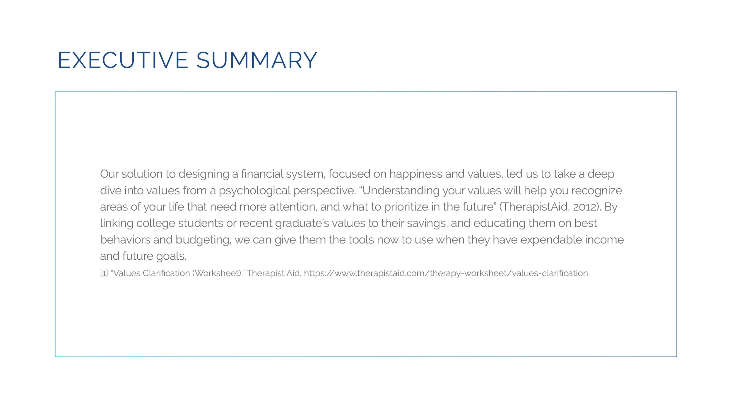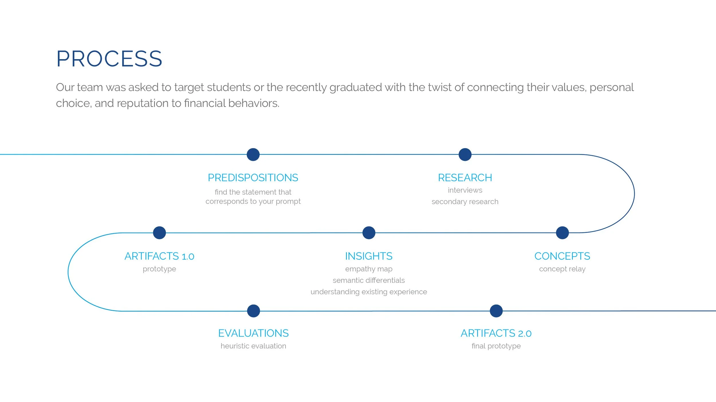 We were asked to target students or those who recently graduated with the twist of connecting their values, personal choices, and reputation to financial behaviors.