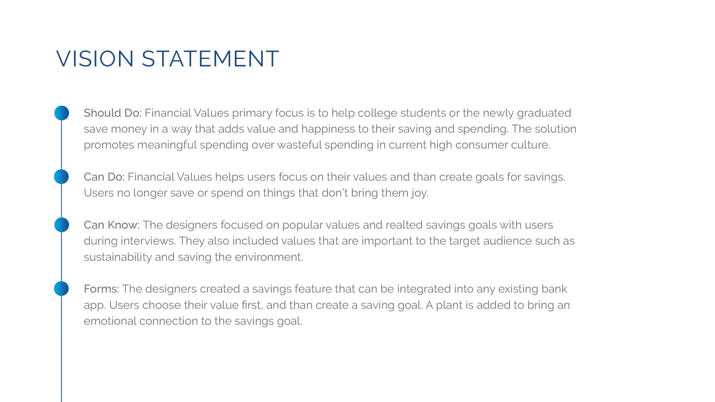 Users are asked what do they stand for? We want the user to link their values to saving goals.