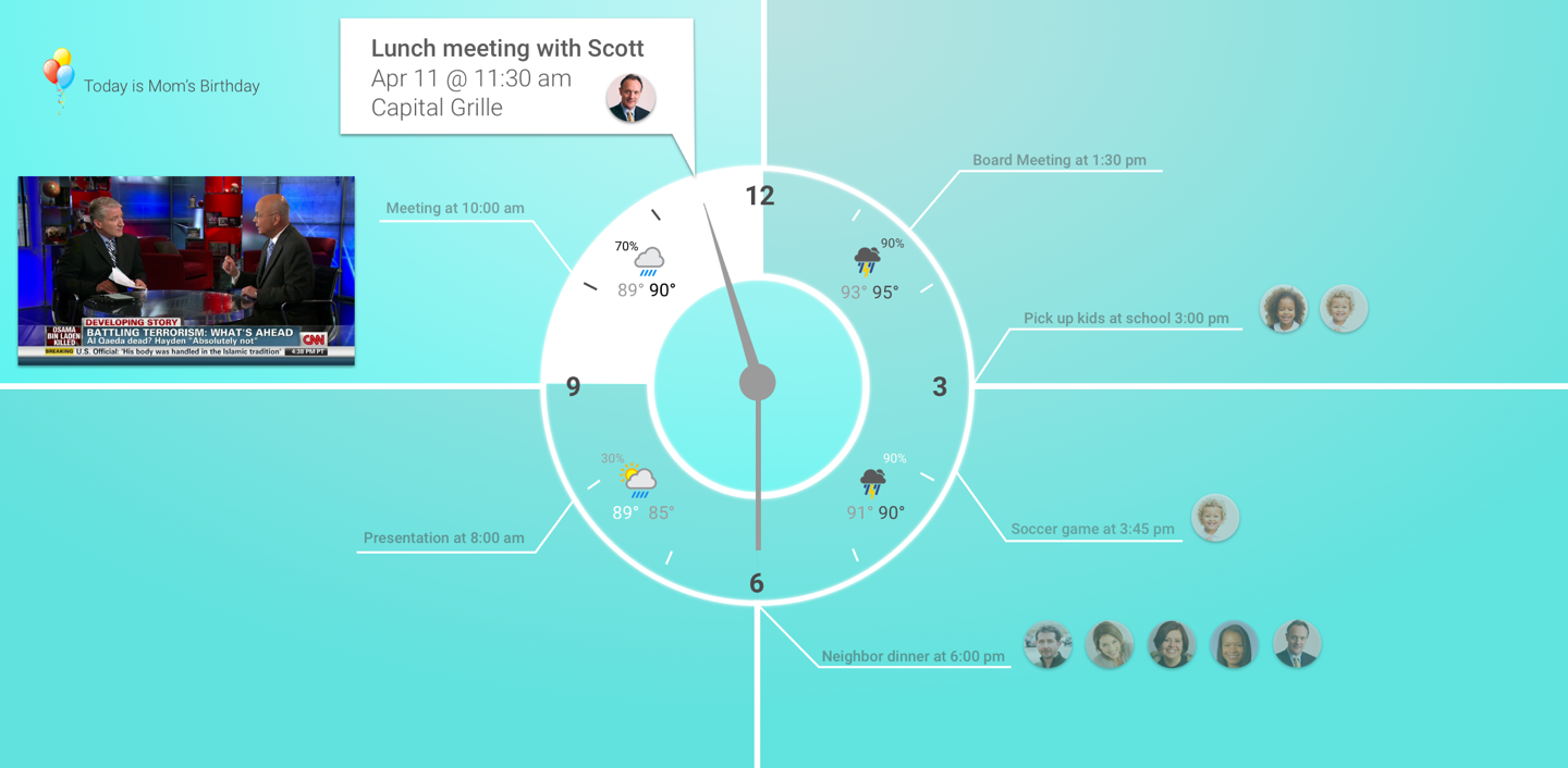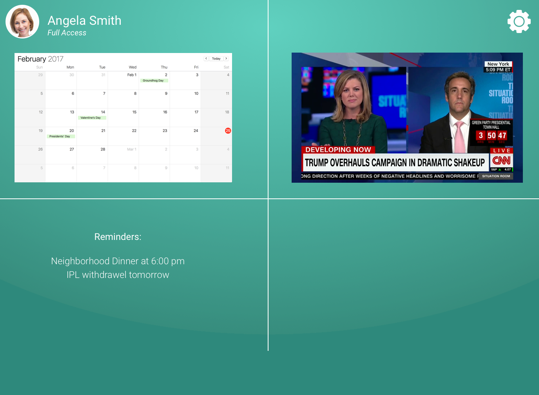 Cognitive reminders are the best way to ensure a task is completed, relieving the user of the burden to remember or the anxiety when a task forgotten. The user is reminded of immediate task and future tasks. They can also customize the screen to see other relevant information, like the news. Time and weather is also shown.