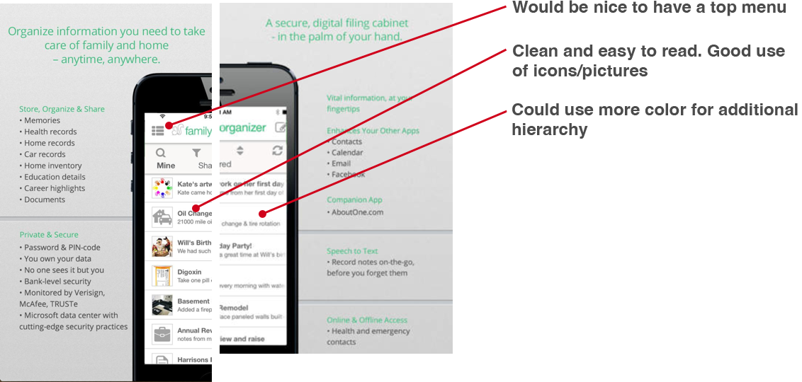 Good: Combination of file storage and family calendar. Good security and free. Also links to bill payments. This combines many functions in one app.