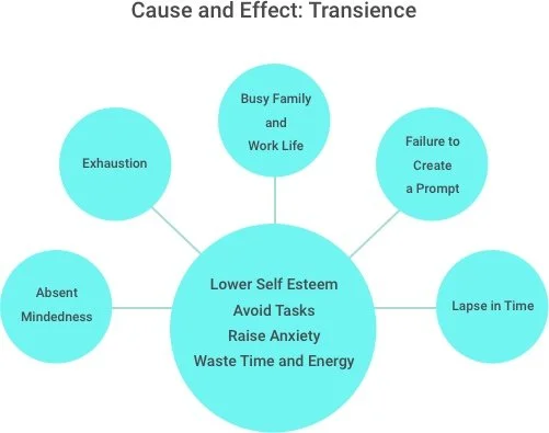 This paper focuses on transience as related to planning and organization in all work and home life aspects. Several things can cause forgetfulness in a day, such as a busy family life, the failure to plan or create a prompt, exhaustion, or procrastination. A typical day can include chaos and stress if necessary materials or appointments are forgotten. Forgetfulness can cause a person to waste time and energy repeating tasks over and over again. For example, wasting time going to the grocery store only to forget one item needed for a recipe causes another trip before dinner can be finished.