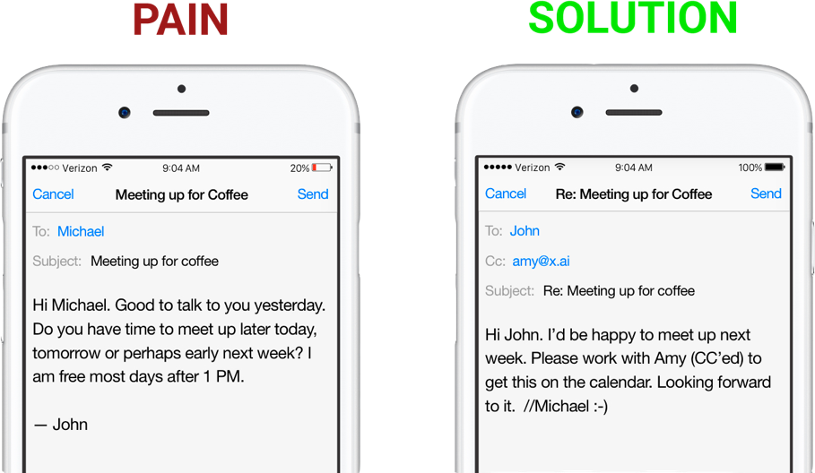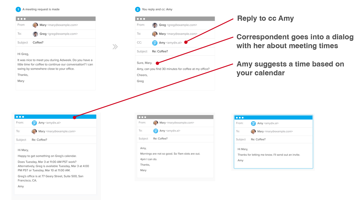 x.ai uses Amy, an AI-powered personal assistant, to work with others to set up meetings on your schedule. "You interact with me as you would to any other person - and I'll do all the tedious email ping pong that comes along with scheduling a meeting."