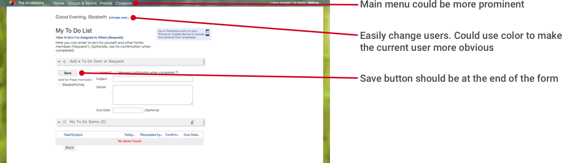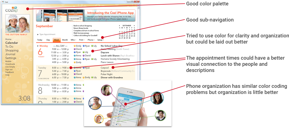 Bad: I couldn't figure out why the password for the desktop wouldn't work for the mobile. The reviews find that having one password for all members is a security problem. The calendar section could be cleaner/better organized. Does not share well with third party calendars.
