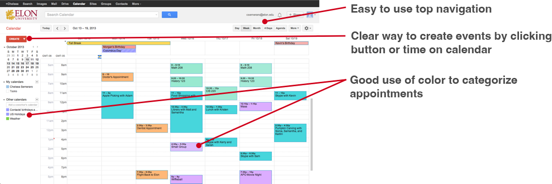 Good: I like that you only need to setup one account. Has good sharing functions. Sends weekly emails for weeks upcoming agenda. Allows you to use the calendar for your personal appointments and as a family calendar.